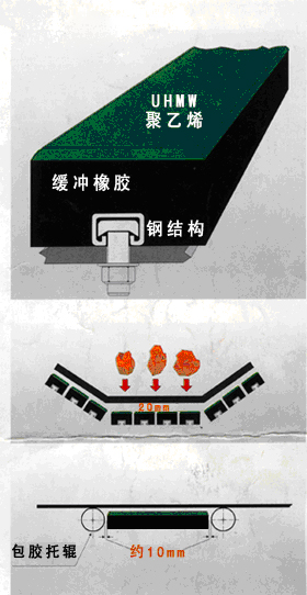◇缓冲条的表面材料HMW-PE表面光滑且耐磨,可减少摩擦阻力,从而降低物料对皮带的冲击o