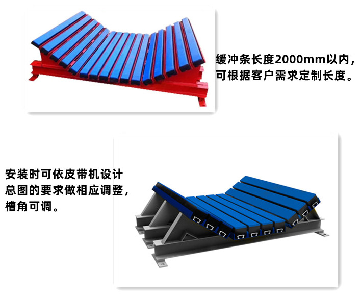 缓冲床的纵向设置,与皮带运行的方向一致,可有效防止皮带撕裂 |