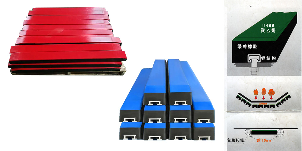 缓冲条的表面材料UHMW-PE(超高分子量聚乙烯板材)表面光滑且耐磨,可减少摩擦阻力,从而降低物料对皮带的冲击。现场安装维护简便,缓冲条可单支或单侧更换,旋松T型罗栓即可快速更换缓冲条。