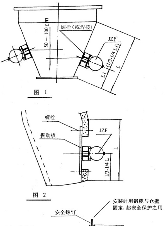 3、全混凝土和带加强筋钢制料仓,在仓内应附设振动板,ZF型振动防闭塞装置应按装在振动板上,如图2所示。