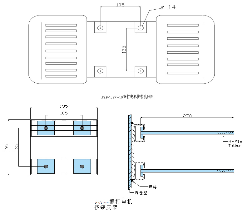 ZF型振动防闭塞装置为上部是YZO型振动电机,下部是底架(需用户自已配),用高强度螺栓联接。(本装置通过电器控制箱与系统程控和堵塞检测器连接,是输煤自动化系统中的一个组成部分。电控箱为用户选配件,需单独订货)。