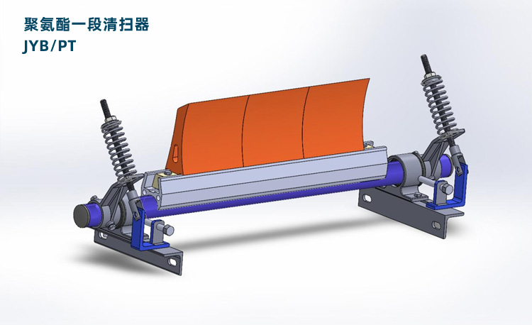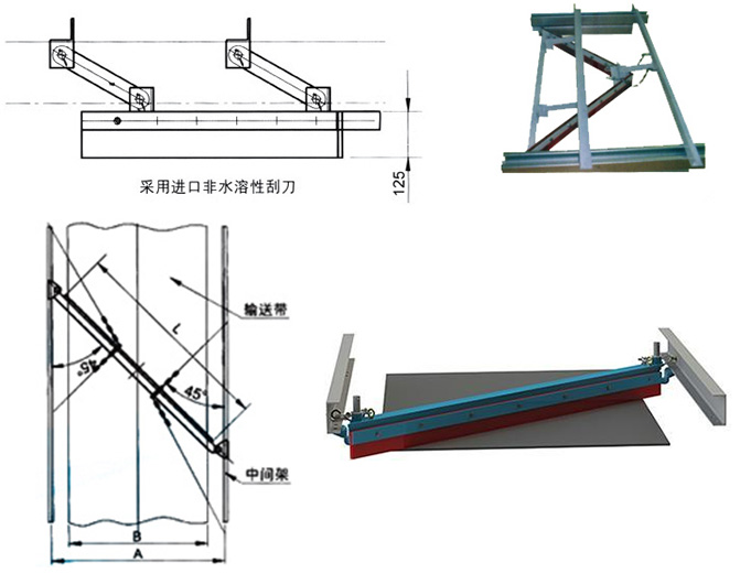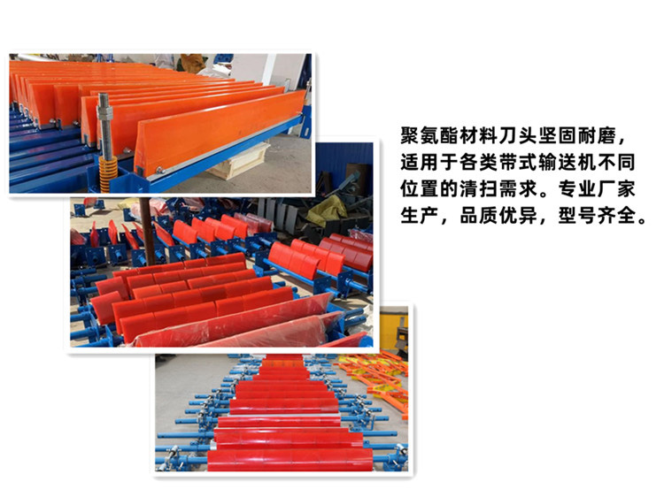 刮刀采用聚氨酯复合材料,利用模具一体加硫成形,刮刀面平整,直线度好,低摩擦、高耐磨、高强度,具有稳定的刮料效果。可有效清除残留皮带上之细粒、湿粘物料。预压式调压器确保刮刀与皮带的稳定接触压力。刮刀面由多块窄幅聚氨酯刮板组成,具有孔形缓冲孔,对各种皮带都有良好跟随性。