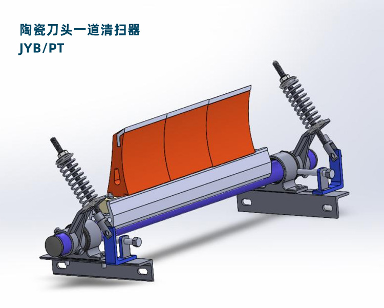 采用人字形刮刀,刮刀面平整成一平面,可有效清除残留皮带上之细粒,湿粘物料,缓冲座组合面积大,不断裂,不积料,可避免刮刀口崩裂损及皮带,也可用于逆向运转皮带。刀座下直立的缓冲弹簧组,可确保与皮带的良好接触和刮料效果。