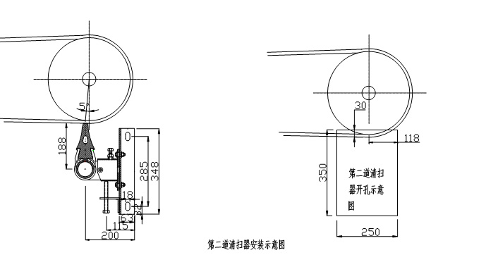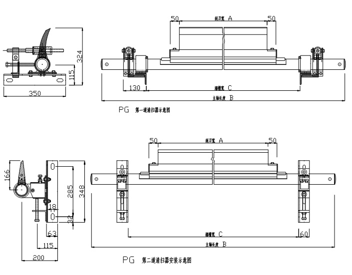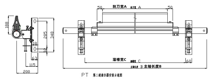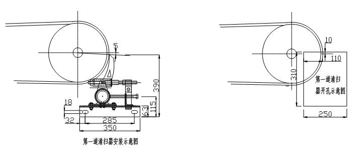 P型清扫器头部二道清扫器,安装于头轮下面平稳工作面处。用于清除头轮下方皮带的粘附物料。H、P型清扫器通常配套使用。