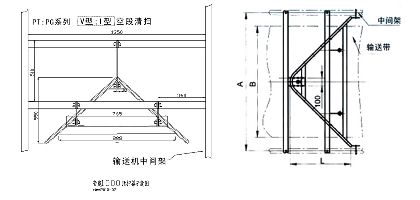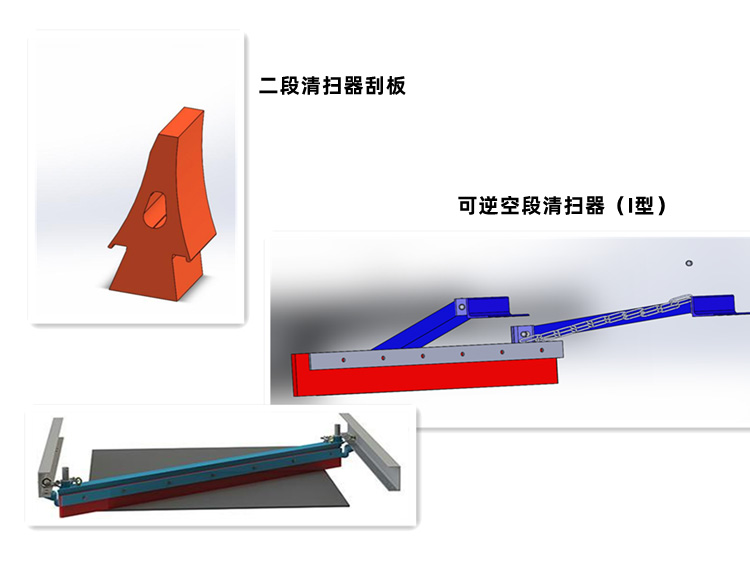 I型(空段可逆)清扫器安装于可逆运行的输送机头部、尾部的非工作面上。用于在头部、尾部清除非工作面上的粘附物料。