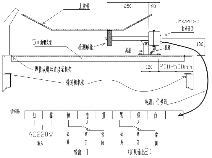红线、棕线:输入220V交流电源(订货可选择24V/DC电源供电)