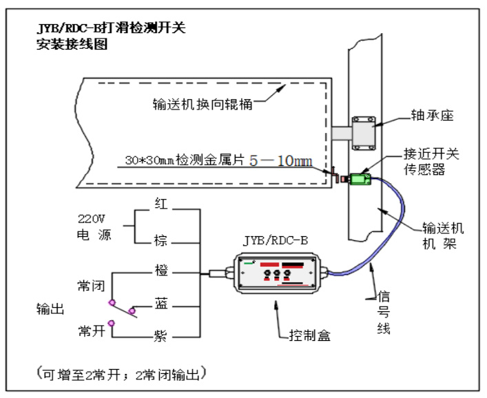 控制器安装在皮带输送机从动辊筒机架上。检测器检测端要垂直于辊筒端面。两个铁片安装在从动辊筒上,安装时把铁片用螺丝或焊接固定,铁片中心必须对准接近传感器端面圆环中心,距离必须保证在5~10mm之间。