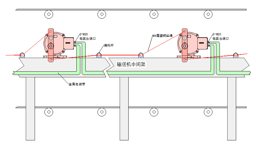 (2)把拉绳(¢4mm覆塑钢丝绳)分别系在开关转臂拉环孔上,两只开关间隔距离小于40m为宜,两端拉绳要平行于胶带机沿线布置,并在间隔3—4m左右处安装托环起支撑作用,以减少其挠度。