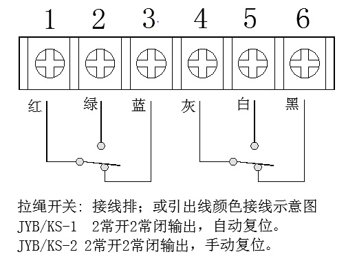 本产品I、II型采用移动凸轮结构,当拉动任意一侧拉绳时,便驱动凸轮,使开关动作转换发出停机信号,I型采用自动复位,II型采用手动复位。