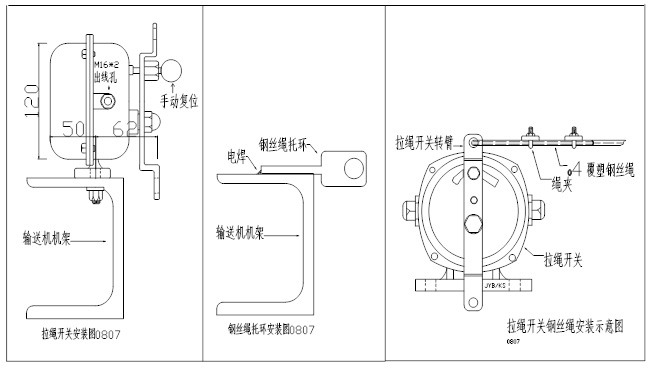 2、拉绳开关安装完毕后,两侧拉绳松紧适宜,挠度小,拉拉绳后,开关能可靠复位。