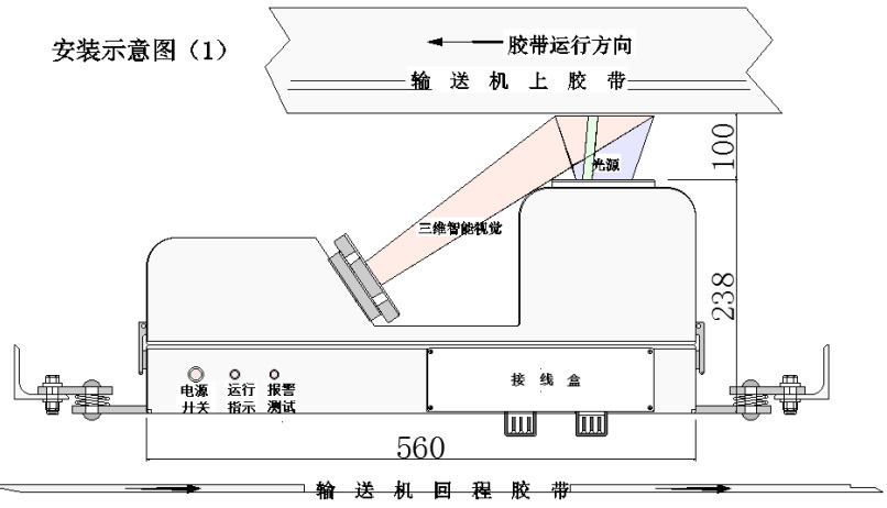 装置安装在受料口溜槽后2-5米位置,先把两根角钢支架与输送机中间架焊接或螺丝连接,然后把检测装置安装到角钢支架中间上,光源透镜端为胶带来料方向,调节设备连接支架减震片高度,使检测装置至高点(透镜平面)与胶带下平面距离至80-125mm左右并与胶带下平面平行。